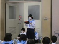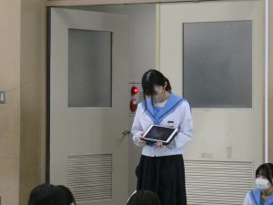 今回は3年生3人でした。睡眠中にビクッとなる「ジャーキング」や肘をぶつけたときにジーンとなる「ファニーボーン」など日常にある現象の名前の紹介がありました。好きなことの紹介では、歌を歌うことと推し活について、推しの写真も見せながら話してくれましたね。また、給食の「きんぴらごぼう」について、あまりの美味しさに最初に食べたときの感動が忘れられない話をしてくれました!さすが3年生、堂々とした良いスピーチでした!