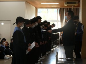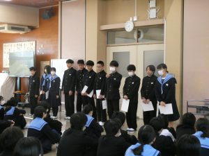 執行部、専門委員長、学級委員の認証式を行いました。認証状を受け取った後は一人ずつ、意気込みを発表してくれました。また、今回から新執行部が司会、進行をしてくれます。これからのみなさんの活躍に期待していますよ!