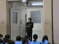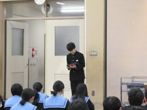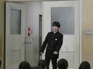 今回は2年生3人の発表でした。肘を顎につける、首は360度回らない等、人間の限界についての紹介がありました。実際にできるか試す場面も見られましたね。また、マウンテンバイクで山の初心者コースを走ったけれど、カーブをうまく回れなかったずに転んでしまった話、休日に友達とサイクリングに出掛け上津まで行った話でも、転んでしまった話をしてくれました。安全運転を心がけ、ケガには注意しましょう!