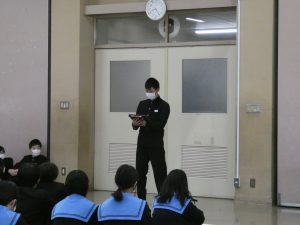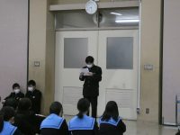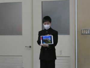 今回は1年生3人の発表でした。野球の大会に出場したときに緊張することが多く、緊張を和らげる方法を調べて腹式呼吸やストレッチをしてみたという話、ゲーム「マインクラフト」のいいところとして、一回買うとずっと遊ぶことができるという話、先日あった百人一首大会について振り返り、来年は一枚でも多くとりたいという話をしてくれました。3人とも自分の言葉で話せていましたね。
