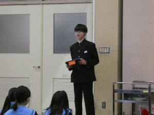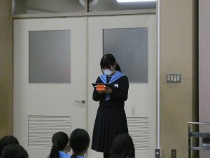 今回は2年生2人でした。おせち料理の話では、伊達巻、紅白かまぼこ、栗きんとんの紹介があり、それぞれなぜ縁起がいいとして入れられているのか理由を話してくれました。また、趣味の話では、ガンダムや車などのプラモデルを作ることを話してくれました。質問タイムでは、どれくらいプラモデルを持っているのかの質問もありましたね。